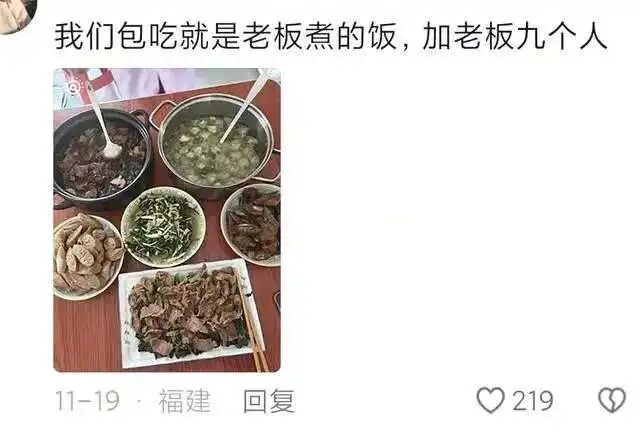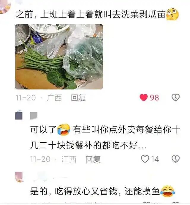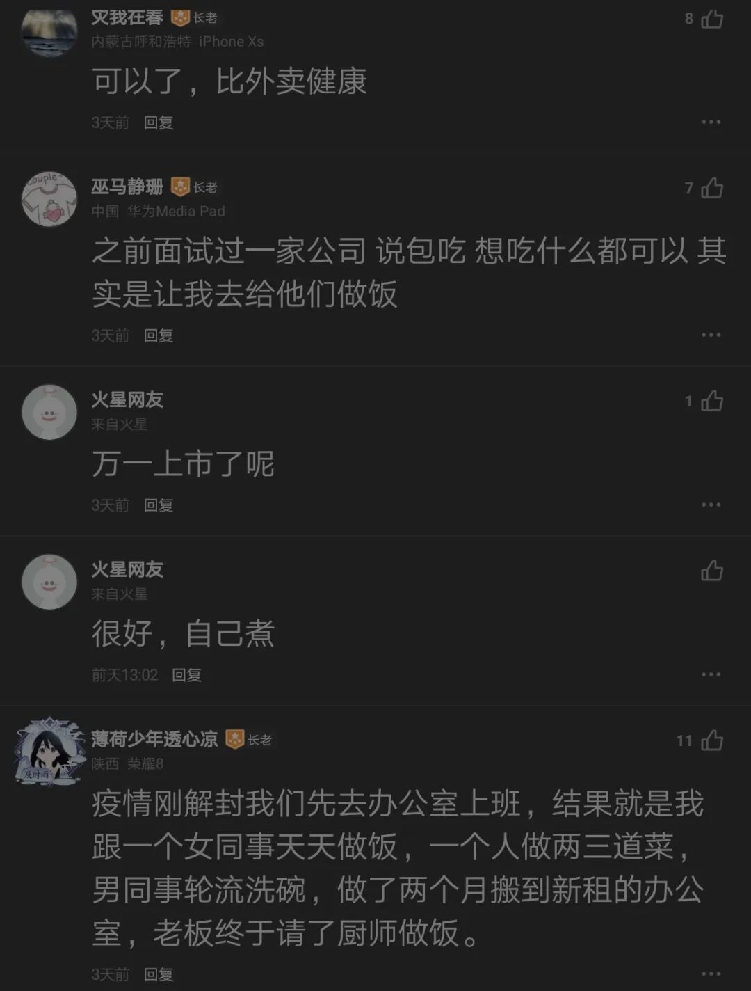 也有网友共享了相对庆幸的经历:疫情刚解封那会,他去一家公司上班,雇主说管饭,成果前两个月,他跟一个女共事天天依次作念饭,一东谈主作念两三谈菜,男共事依次洗碗,天天上班先琢磨买菜作念饭,别提多折腾。好在两个月后,公司搬到了新租的办公室,雇主终于请了专科厨师作念饭,他们才算目田,不必再一边上班一边当“庖丁”。